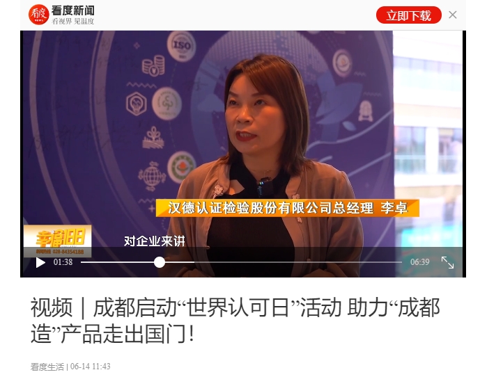 6月9日是第十七個“世界認(rèn)可日”。近日,成都市市場監(jiān)管局、成都市發(fā)改委在東部新區(qū)簡州新城舉辦了2024年成都市“世界認(rèn)可日”活動,漢德認(rèn)證檢驗股份有限公司作為優(yōu)秀認(rèn)證機構(gòu)受邀參加了此次活動。期間,成都廣播電視臺記者對我公司總經(jīng)理李卓進行了采訪;會后,成都廣播電視臺通過在線APP[看度新聞]對此次活動進行了報告。