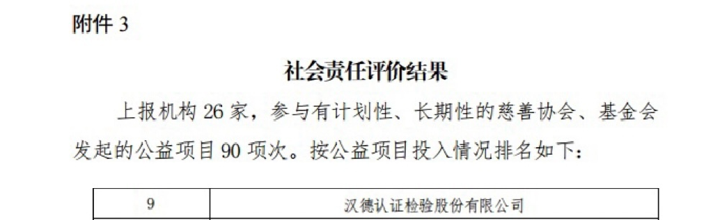 2024年12月9日,中國認證認可協會發布《2023認證機構高質量發展報告》的通知,漢德認證檢驗股份有限公司在1242家認證機構中名列前茅,特別是在社會責任評價中表現突出,成功發起公益項目2次,資金投入位列行業第9名。