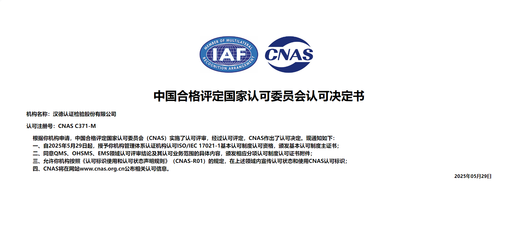 2025年5月30日,漢德認證檢驗股份有限公司(簡稱:漢德認證,英文縮寫:TUVHD,國際品牌:漢德 - INTERCERT)成功獲得中國合格評定國家認可委員會(CNAS)的認可資格(認可注冊號:CNAS C371-M)。即日起,TUVHD 在獲準認可業務范圍內頒發的認證證書可同時帶有 CNAS 認可標識和 IAF 國際互認標志。值得關注的是,漢德認證旗下國際品牌漢德 - INTERCERT 此前已在美國獲得 UAF 認可、韓國獲得 KAB 認可、加拿大獲得 SCC 認可,此次 CNAS 認可的加入,標志著其全球認可標志家族再添重要成員,形成覆蓋中、美、韓、加等主要經濟體的認可資質矩陣。