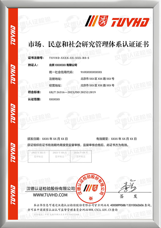 市場、民意和社會研究管理體系認證證書