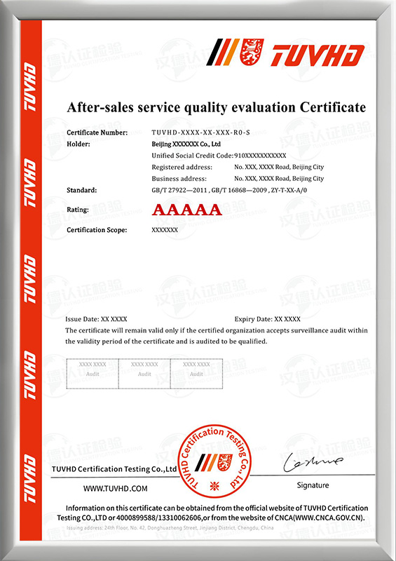售后服務質量測評認證證書