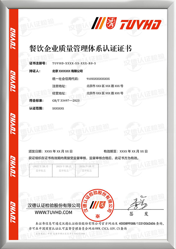 餐飲企業質量管理體系認證證書