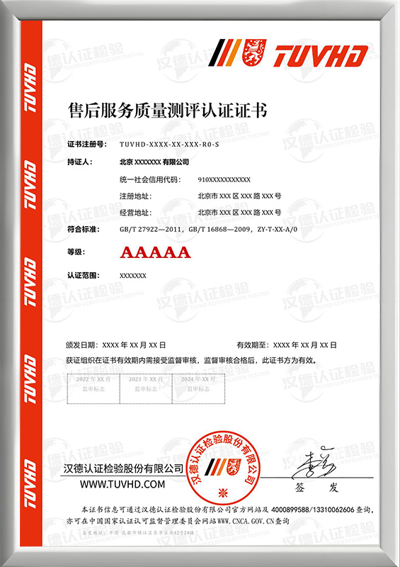 售后服務完善程度認證證書